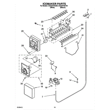 The Ice Container Assembly is an OEM part for Whirlpool refrigerators. This assembly includes the ice bin, where ice is collected, and often features integrated mechanisms or augers for dispensing ice through the refrigerator's door.