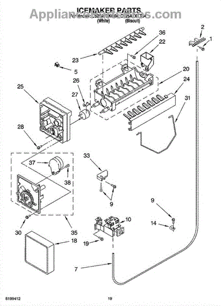 Causes of a bad Ice Container Assembly can include cracks or damage to the bin, which can lead to ice leaks or accumulation in the freezer; wear or malfunction of the dispensing mechanism, affecting its ability to deliver ice.