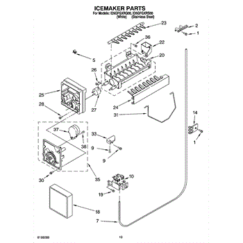 Causes of a bad Ice Container Assembly can include cracks or damage to the bin, which can lead to ice leaks or accumulation in the freezer; wear or malfunction of the dispensing mechanism, affecting its ability to deliver ice.