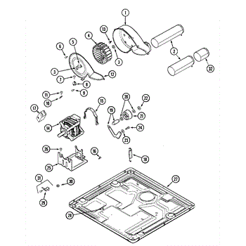 This dryer blower housing encloses the blower wheel and directs air from the drum through the lint filter to the exhaust vent. Replacing a damaged housing restores proper airflow for consistent drying and helps keep lint contained within the airflow path.