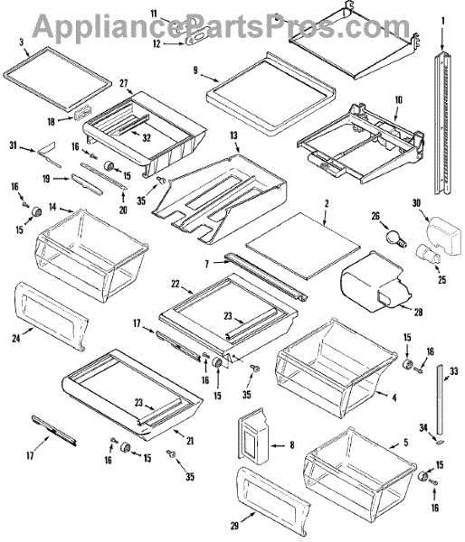 This crisper shelf support is the side-wall bracket that holds the glass shelf/cover above the produce drawers. Replacing a cracked support restores a level shelf and smooth crisper drawer operation.