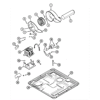 This dryer blower housing encloses the blower wheel and directs air from the drum through the lint filter to the exhaust vent. Replacing a damaged housing restores proper airflow for consistent drying and helps keep lint contained within the airflow path.