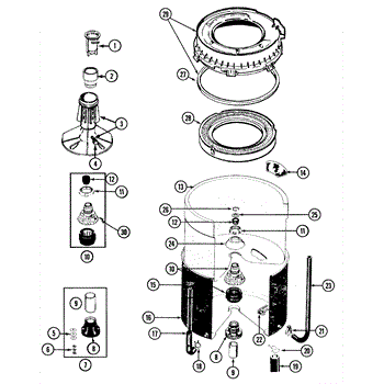 This tub cover and gasket seal the top of the outer tub to contain splashing and prevent leaks during wash and spin. Replacing a cracked cover or compressed gasket restores a tight rim seal and cleaner operation. What it does: