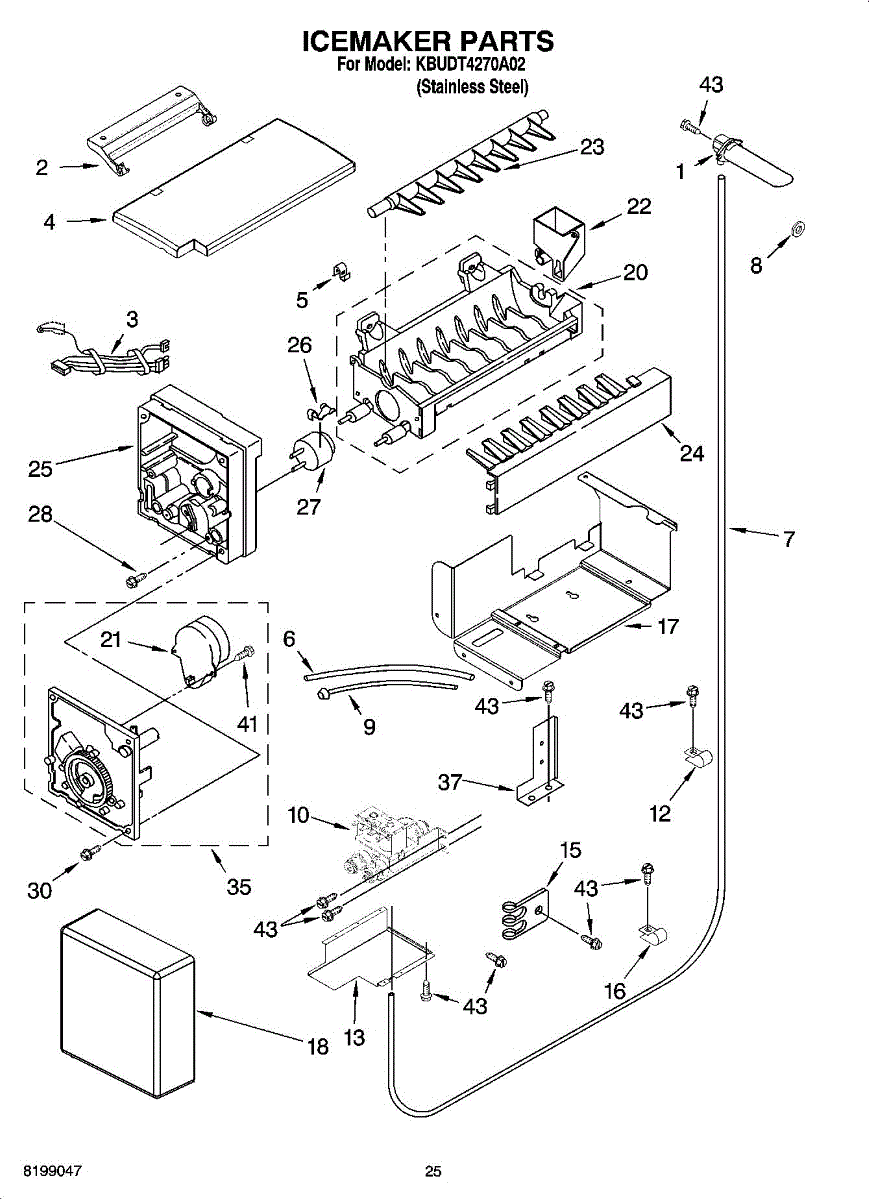 This icemaker fill cup and bearing assembly directs water from the inlet tube into the ice mold and provides the pivot point for the shutoff arm. Replacing a cracked or missing cup helps stop leaks, misdirected fills, and inconsistent ice production.