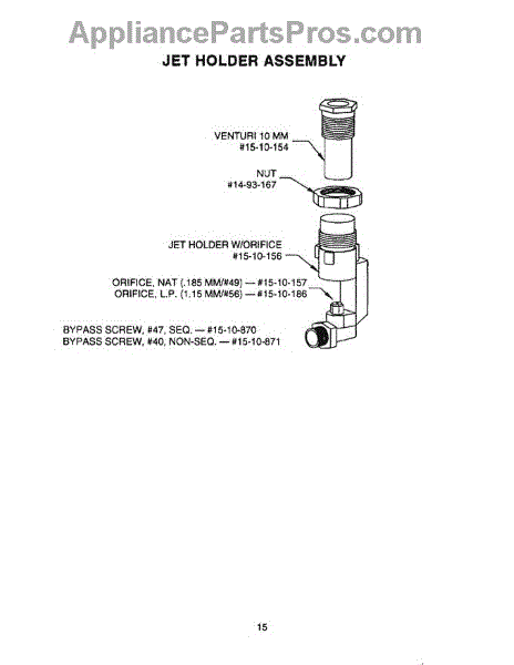 This LP main jet regulates propane flow to a surface burner to maintain a clean, stable flame. Replace a clogged or incorrect jet to restore proper burner performance, especially when converting a cooktop or range from natural gas to LP.