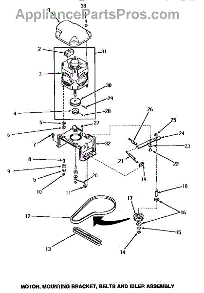 Parts for Amana AA3410: 15 - Motor, Mtg Bracket, Belts & Idler Assy Parts