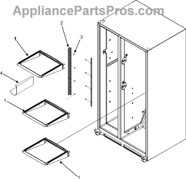 Refrigerator shelf rail slide track for side-by-side models. Replaces cracked, broken, or worn rails that support sliding shelves and drawers.