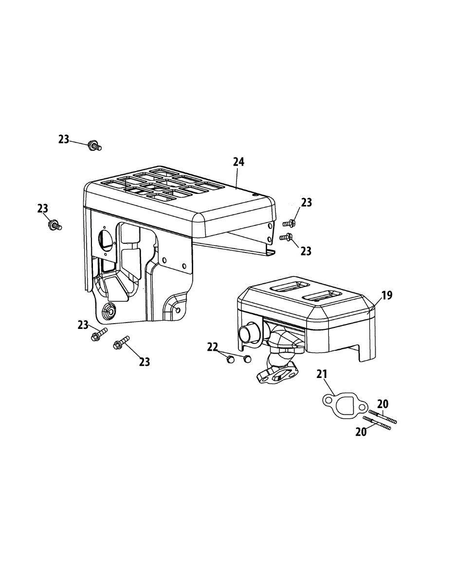 Protective shroud that covers the muffler on snow throwers. Replace if cracked, broken, or missing to shield the muffler and prevent debris contact.