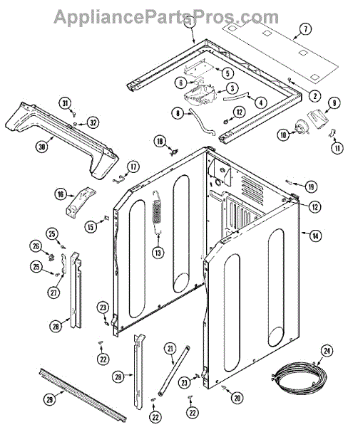This spring support secures a suspension spring to the washer's frame, helping keep the tub stable during wash and spin. Replacing a damaged support restores proper balance control to reduce vibration and banging. What it does: