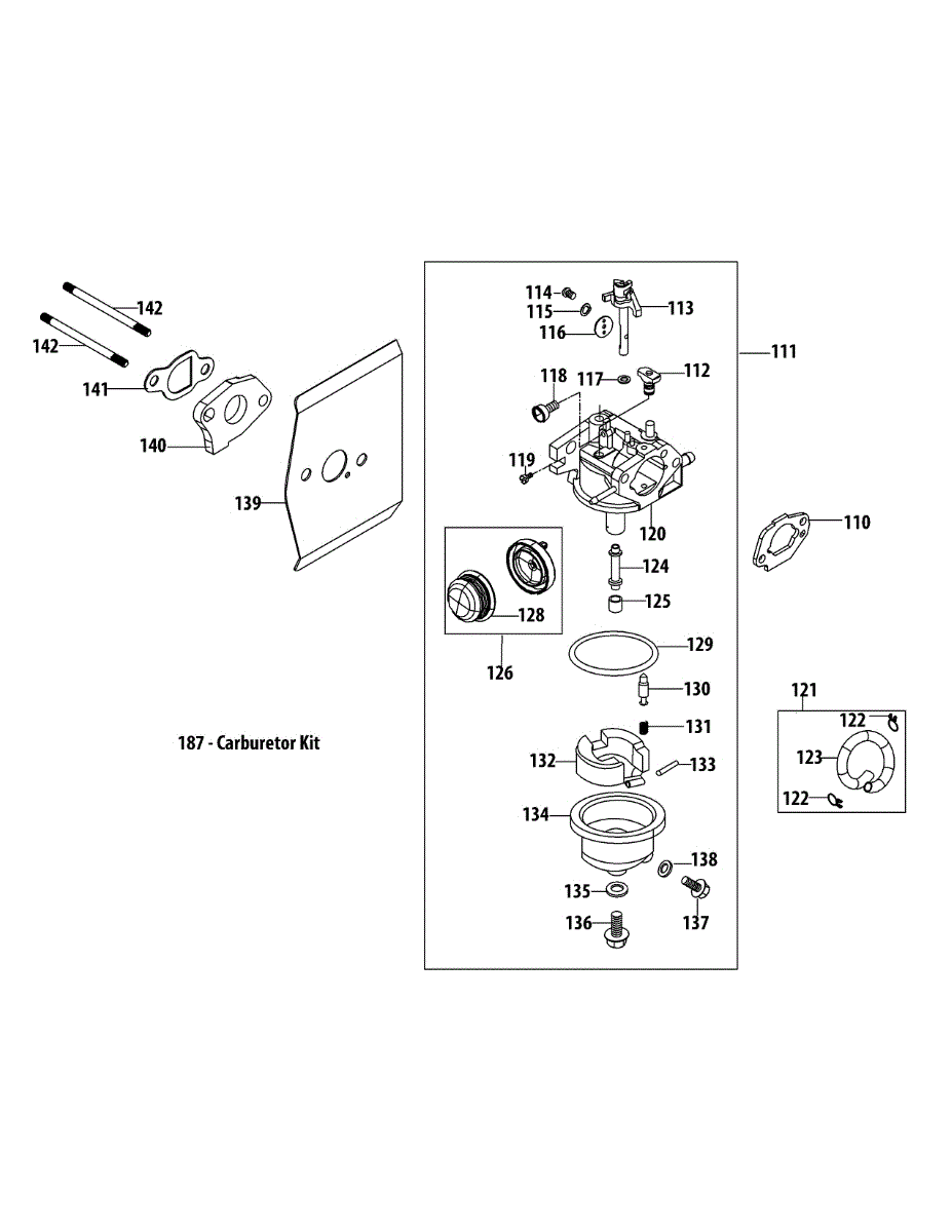 Heat-blocking spacer that sits between the carburetor and engine block on outdoor power equipment. Replace if cracked, warped, or missing gasket.
