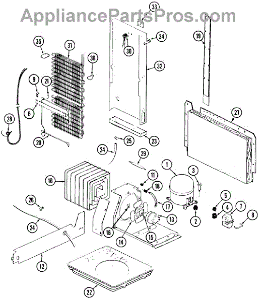 Plastic defrost pan. Evaporator pan hangs from side rails and rests on compressor.