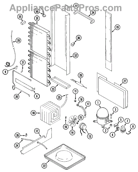 Plastic defrost pan. Evaporator pan hangs from side rails and rests on compressor.