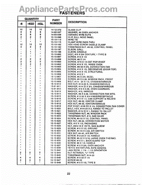 Parts for Thermador PRDS364GL: 22 - Fasteners Parts