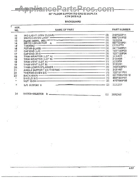 Parts for Frigidaire 2478B: 30" Floor / Backguard Page 2 Parts
