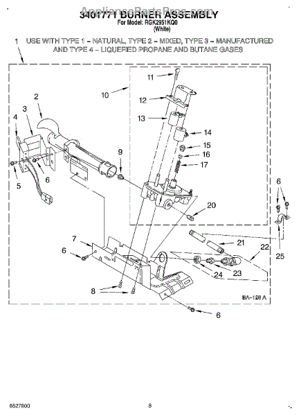Parts for Roper RGK2951KQ0: 05 - 3401771 Burner Assembly Parts