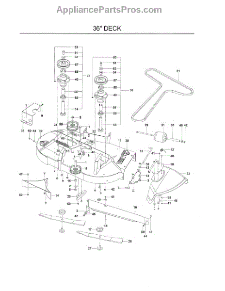 Plastic deflector for 36-inch riding mower decks. Mounts to the mower deck to direct grass clippings. Replace if cracked, broken, or missing.