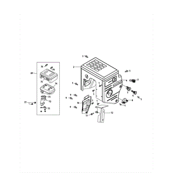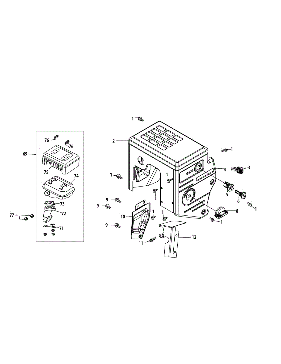 Protective metal shield that covers the muffler on snow throwers. Replace if cracked, damaged, or missing to protect the muffler and prevent burns.