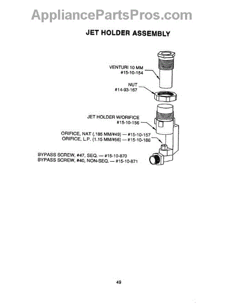 This LP main jet regulates propane flow to a surface burner to maintain a clean, stable flame. Replace a clogged or incorrect jet to restore proper burner performance, especially when converting a cooktop or range from natural gas to LP.