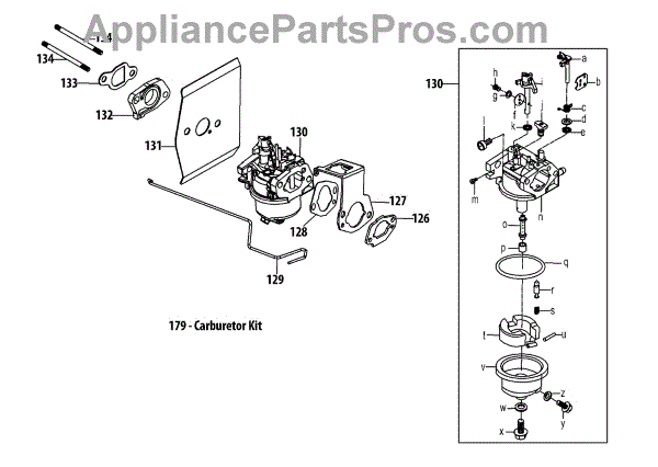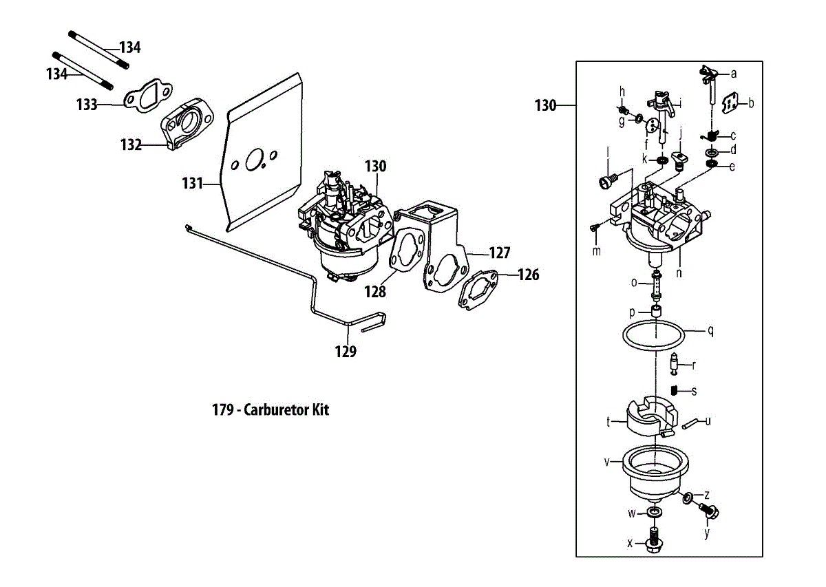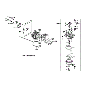 Carburetor kit for small engines on mowers and outdoor equipment. Replace if components are damaged, worn, or missing to restore proper fuel delivery.