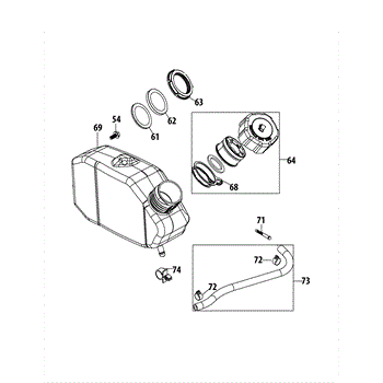Replacement fuel cap assembly for mowers, tillers, and outdoor power equipment. Installs on fuel tank to seal and prevent spills. Needed when cap is cracked, broken, or missing retainer.