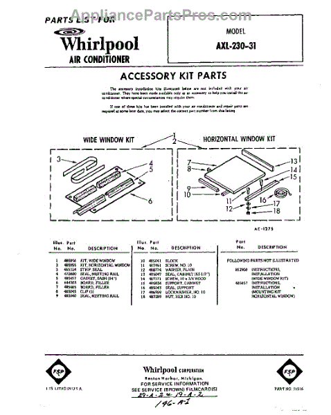 Parts for Whirlpool AXL23031: 01 - Accessory Kit Parts