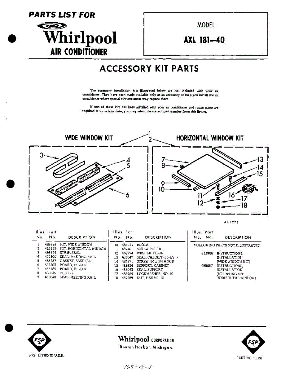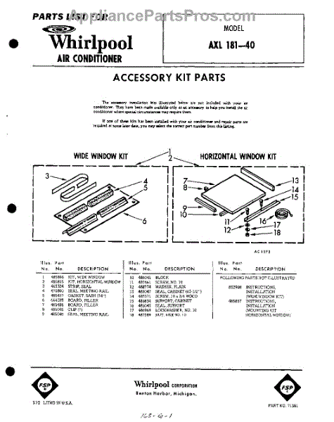 Parts for Whirlpool AXL18140: 01 - Accessory Kit - Window Parts