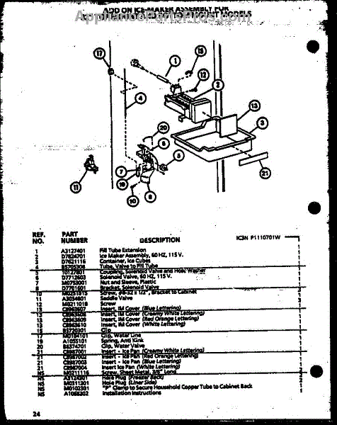 Parts for Amana TQ18QB2W-P1111309WW: Add-On Icemaker (Ic3n / P1110701w) Parts