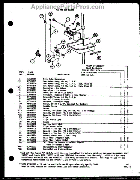 Parts for Amana TCI20K-P7803218W: Add On Ice-Maker (Ic3k / P7621309w) (Ic3k / P7621310w) (Cic4k / P7621311w) Parts