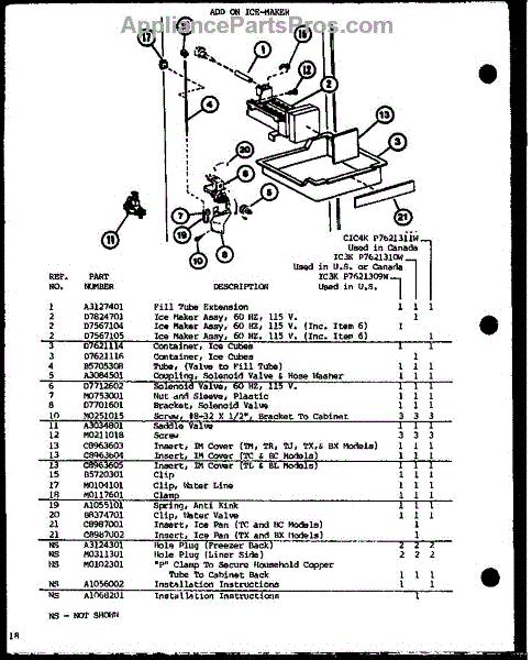 Parts for Amana BL20M-P7812518W: Add On Ice-Maker (Ic3k / P7621309w) (Ic3k / P7621310w) (Cic4k / P7621311w) Parts