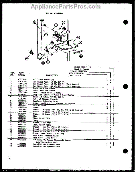 Parts for Amana TC20M-P7858504W: Add On Ice-Maker (Ic3k / P7621309w) (Ic3k / P7621310w) (Cic4k / P7621311w) Parts