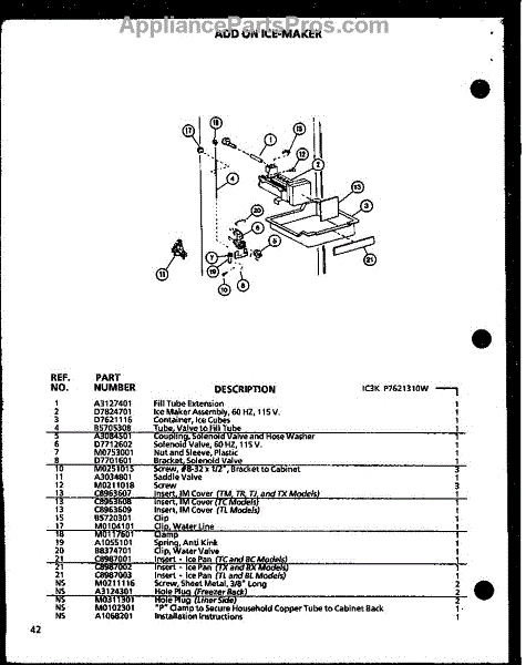 Parts for Amana TJ22N-P1102115W: Add On Ice-Maker (Ic3k / P7621310w) Parts