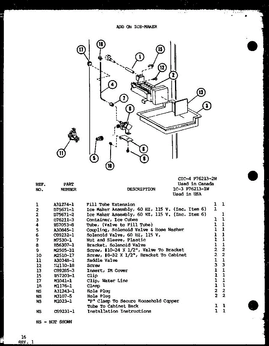 Parts for Amana TL18G-P76512-6W: Add On Ice-Maker (Ic-3 / P76213-1W) (Cic-4 / P76213-2W) Parts