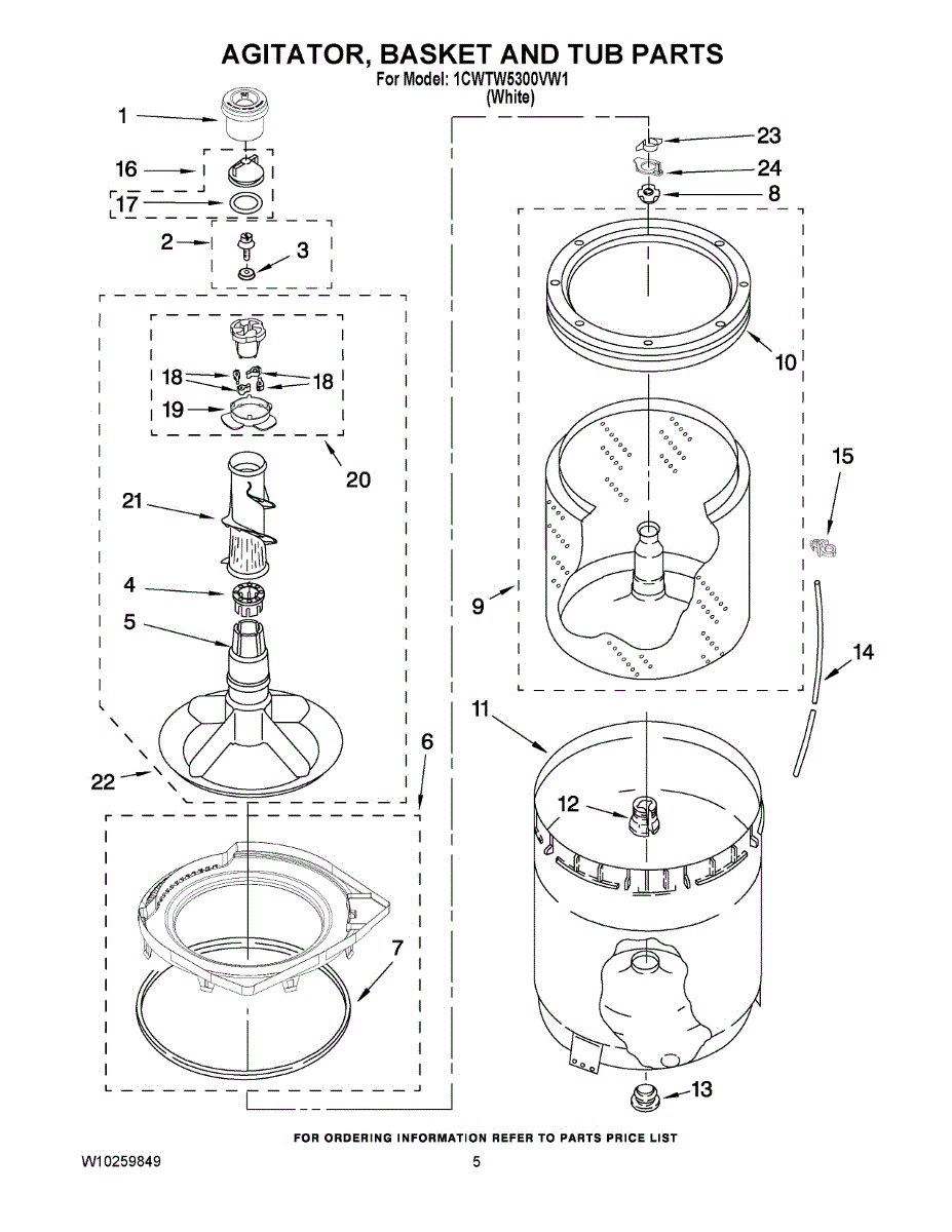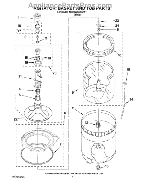 Inner tub basket holds clothing during wash cycles. Replace if cracked, rusty, or broken. Installs in center of washer between outer tub and agitator.