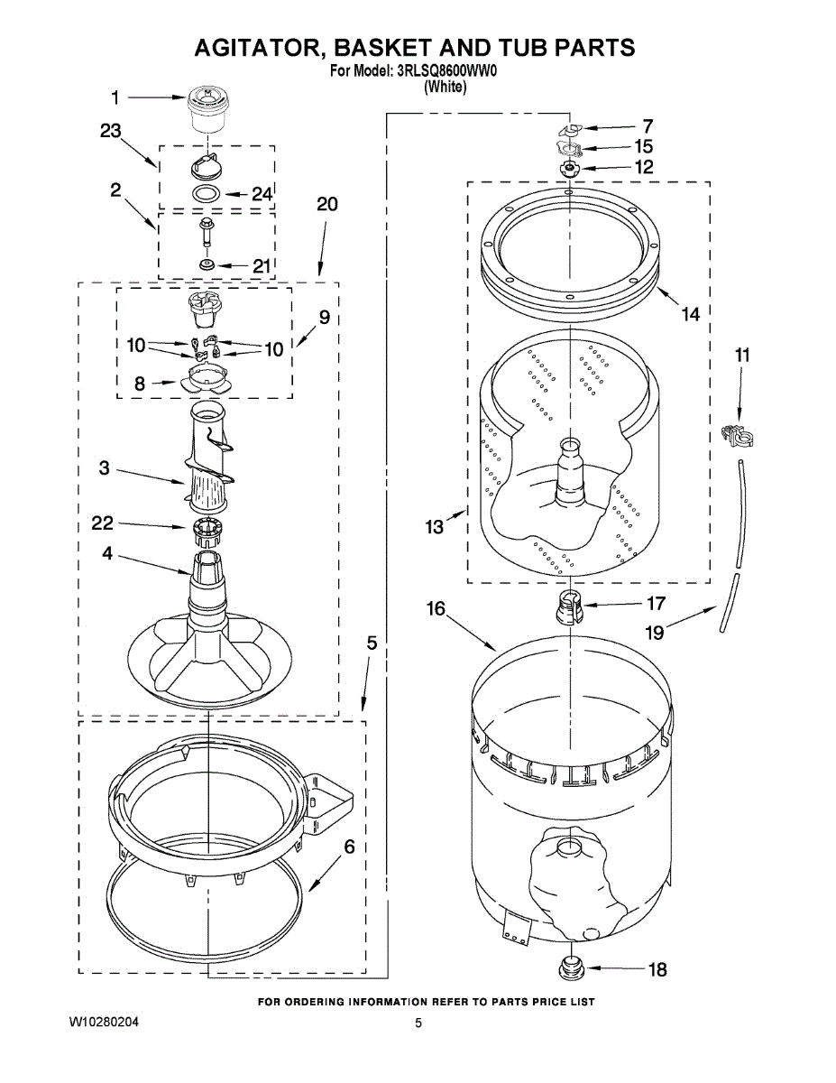 Inner tub basket holds clothing during wash cycles. Replace if cracked, rusty, or broken. Installs in center of washer between outer tub and agitator.