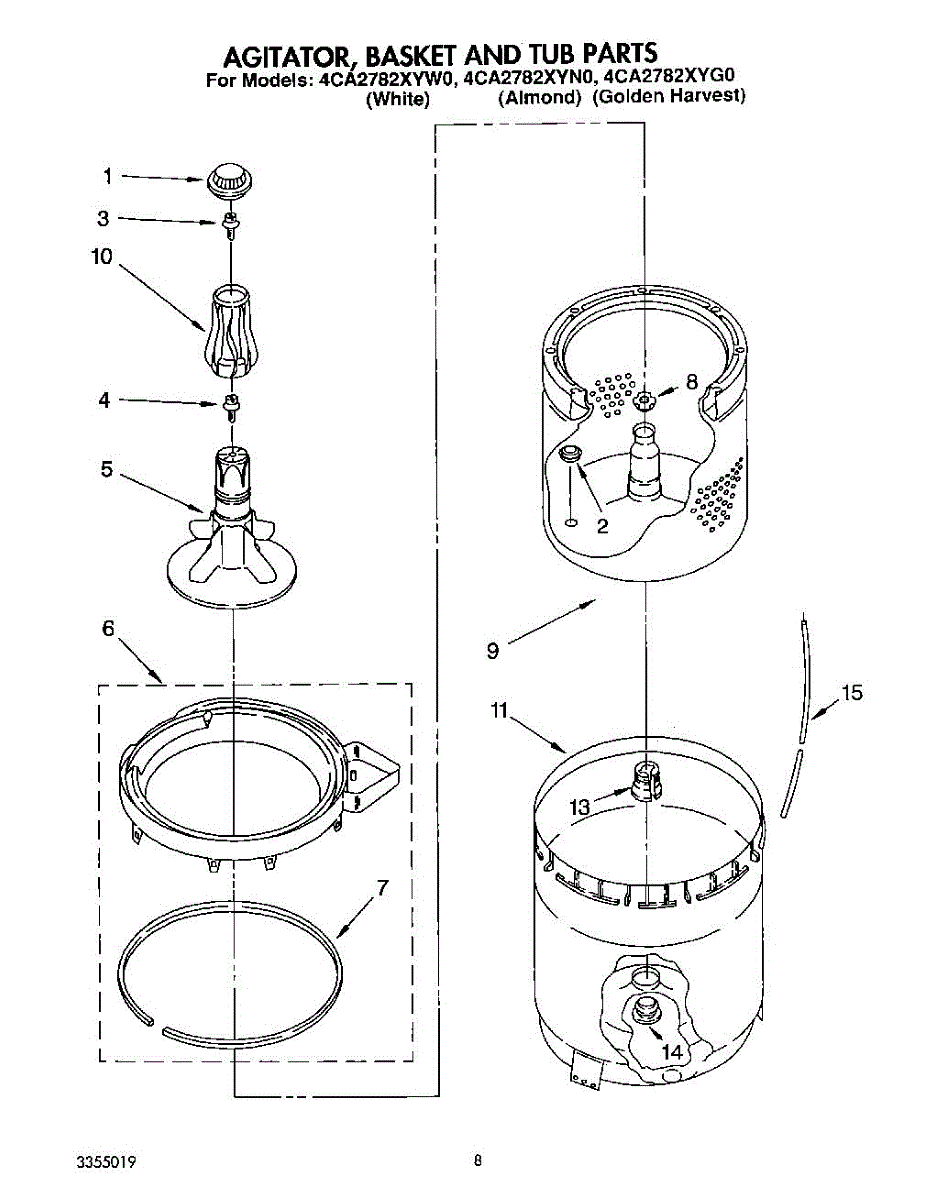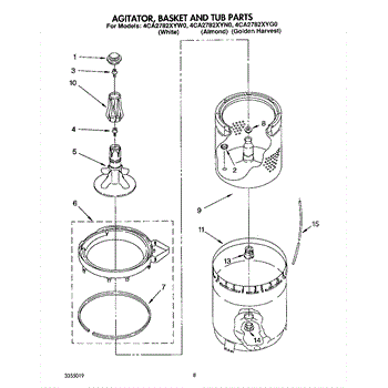 Inner tub basket holds clothing during wash cycles. Replace if cracked, rusty, or broken. Installs in center of washer between outer tub and agitator.