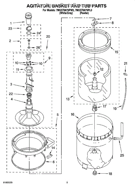 The Complete Agitator Assembly is an OEM part for Whirlpool washing machines. This assembly includes the central vertical agitator component along with the retainer ring. Together they are responsible for the agitation and rubbing motions that work to remove soils and stains from clothing during wash cycles. Causes of a bad agitator assembly can include wear and tear leading to wobbly or loose motions, cracks in plastic components from repeated impacts, or corrosion of metal components. Symptoms of a bad complete agitator assembly include: