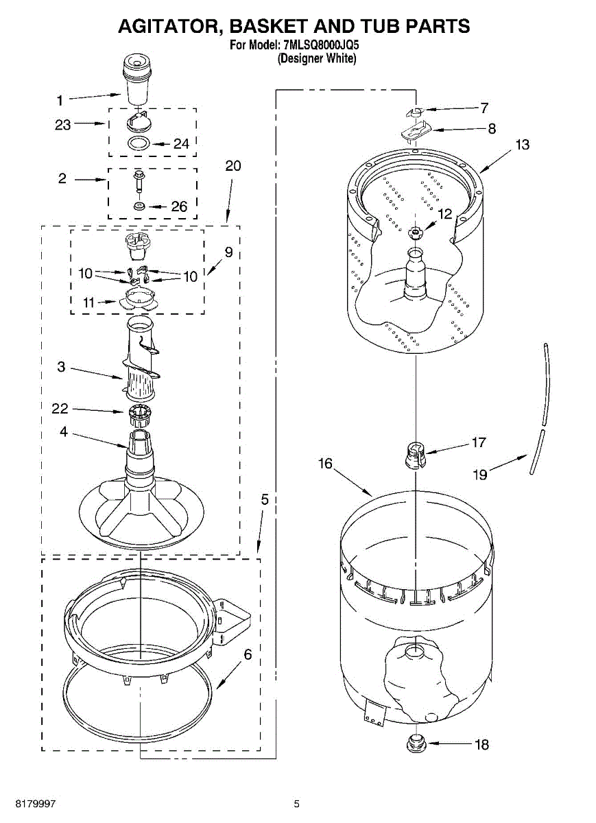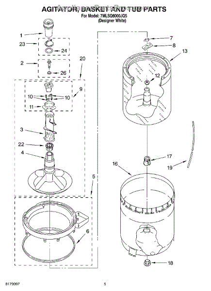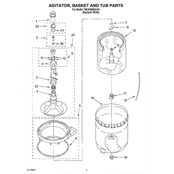 Inner tub basket holds clothing during wash cycles. Replace if cracked, rusty, or broken. Installs in center of washer between outer tub and agitator.
