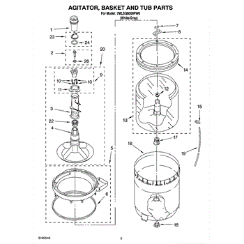 Inner tub basket holds clothing during wash cycles. Replace if cracked, rusty, or broken. Installs in center of washer between outer tub and agitator.