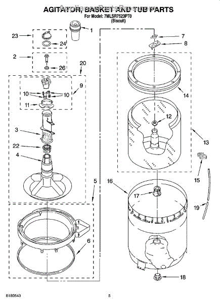 The Complete Agitator Assembly is an OEM part for Whirlpool washing machines. This assembly includes the central vertical agitator component along with the retainer ring. Together they are responsible for the agitation and rubbing motions that work to remove soils and stains from clothing during wash cycles. Causes of a bad agitator assembly can include wear and tear leading to wobbly or loose motions, cracks in plastic components from repeated impacts, or corrosion of metal components. Symptoms of a bad complete agitator assembly include: