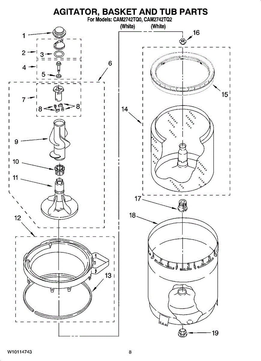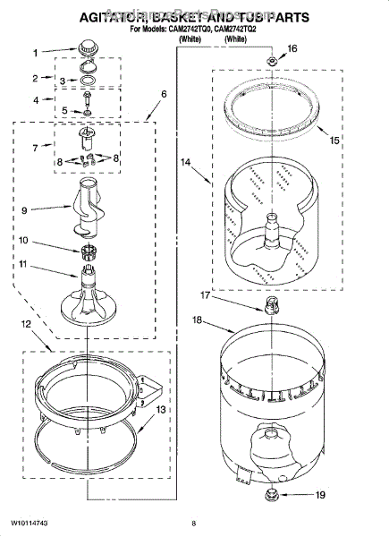The Agitator Kit is an OEM replacement part for Whirlpool top-loading washer models. Installed in the center of the wash basket, it aids in the mechanical agitation central to regular laundry cleaning.It contains the plastic cam and four plastic dogs needed to repair a malfunctioning or noisy agitator during the wash cycle.