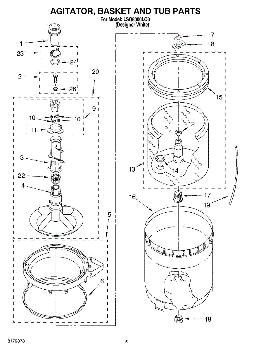 Inner tub basket holds clothing during wash cycles. Replace if cracked, rusty, or broken. Installs in center of washer between outer tub and agitator.