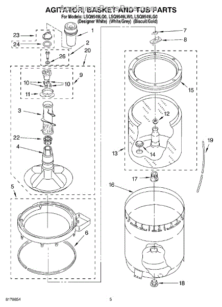 Inner tub basket holds clothing during wash cycles. Replace if cracked, rusty, or broken. Installs in center of washer between outer tub and agitator.