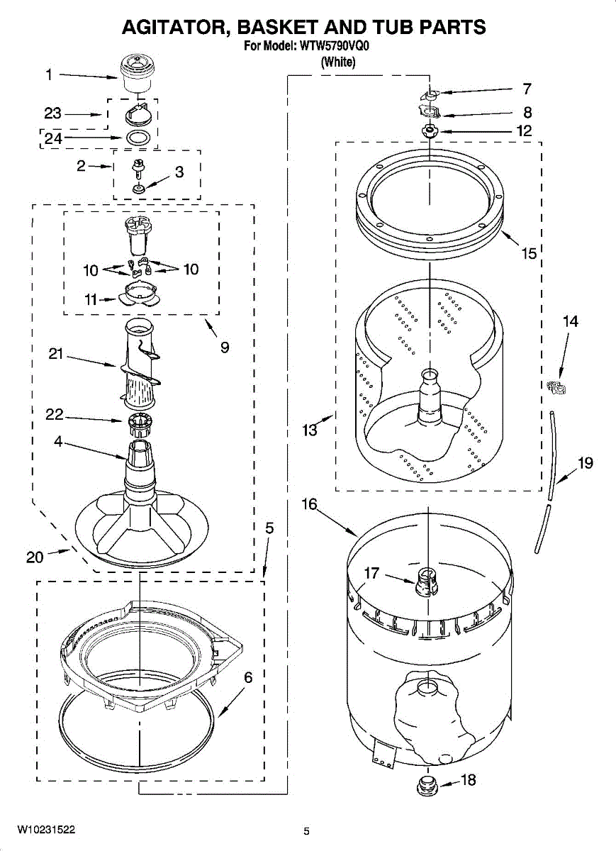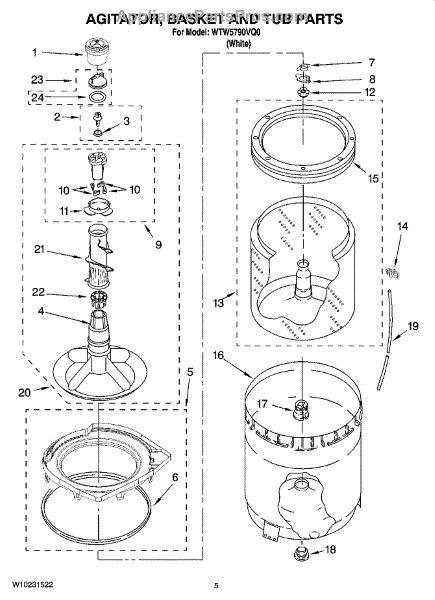 Inner tub basket holds clothing during wash cycles. Replace if cracked, rusty, or broken. Installs in center of washer between outer tub and agitator.