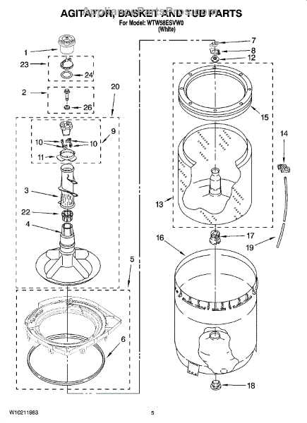 The Complete Agitator Assembly is an OEM part for Whirlpool washing machines. This assembly includes the central vertical agitator component along with the retainer ring. Together they are responsible for the agitation and rubbing motions that work to remove soils and stains from clothing during wash cycles. Causes of a bad agitator assembly can include wear and tear leading to wobbly or loose motions, cracks in plastic components from repeated impacts, or corrosion of metal components. Symptoms of a bad complete agitator assembly include: