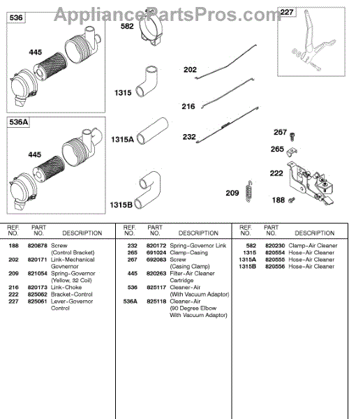 Parts for Briggs & Stratton 589447-0305-E2: Air Cleaner, Control Bracket, Springs, Links Parts