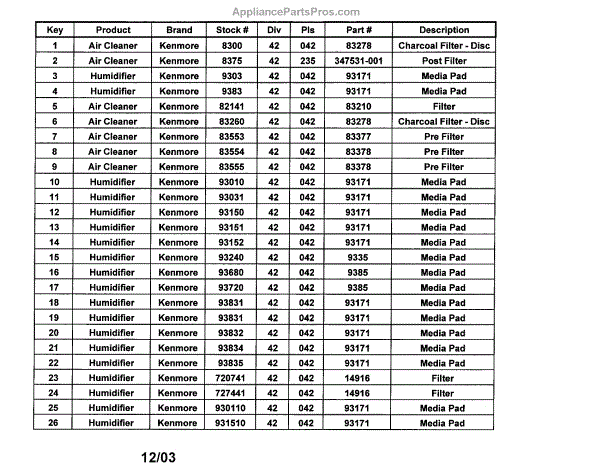 Parts for Kenmore 9303: Air Cleaner & Humidifier Filters Parts