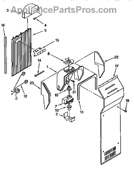 This fan scroll is the plastic housing that surrounds the evaporator fan in the freezer section. It directs air across the evaporator coils and into the ducts, helping your refrigerator move cold air evenly and maintain stable temperatures.