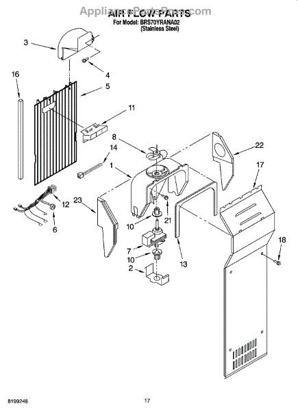 The Evaporator Fan Motor is an OEM replacement part for Whirlpool refrigerators. Located inside the refrigerator compartment, it powers the evaporator fan, which circulates air across the cooling coils. This is the motor only. For the blade order part number WP2169142.