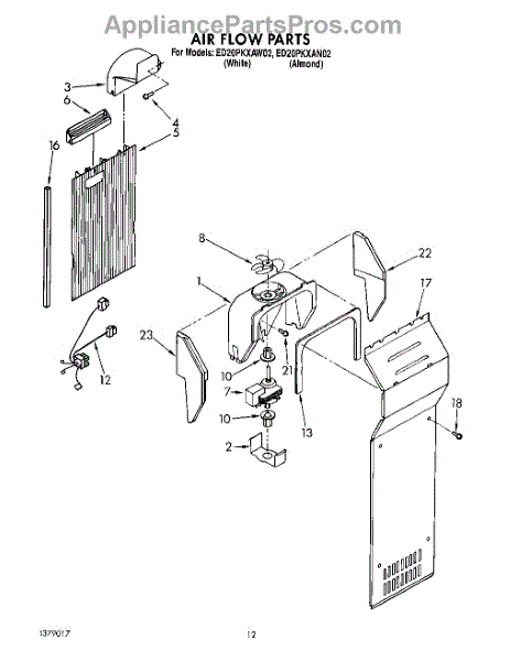 This fan scroll is the molded blower housing that directs airflow from the appliance fan for efficient cooling and ventilation. Replacing a damaged scroll restores proper air path and reduces airflow noise or performance issues. What it does