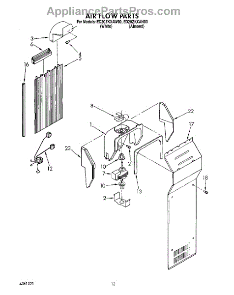This fan scroll is the molded blower housing that directs airflow from the appliance fan for efficient cooling and ventilation. Replacing a damaged scroll restores proper air path and reduces airflow noise or performance issues. What it does